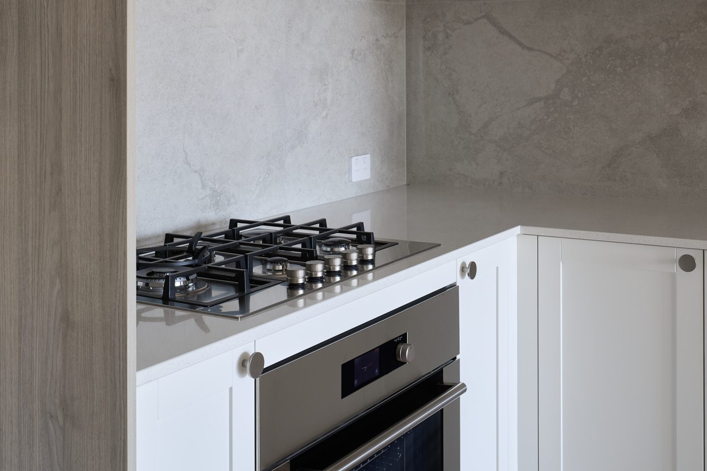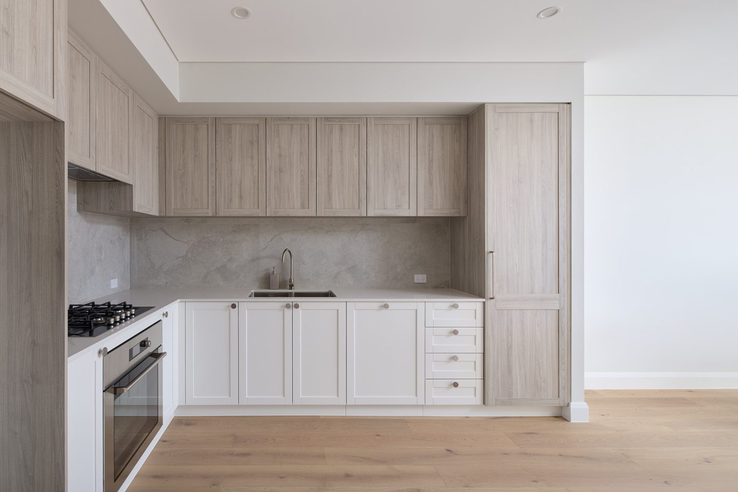 The open-plan layout flows seamlessly from the designer kitchen through the dining and living areas to a private balcony. The well-appointed kitchen features stainless steel appliances, a gas cooktop, and ample storage.